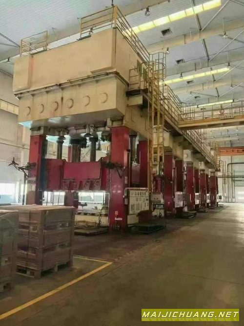 合肥锻压1000吨压力机滑块行程:1300mm开口高度:2000mm工作台:mm液压垫尺寸:mm滑块速度:空程450mm/s 工作25-50mm/s 回程400mm/s外形尺寸:m总功率:337.5kw双侧移交换工作台_