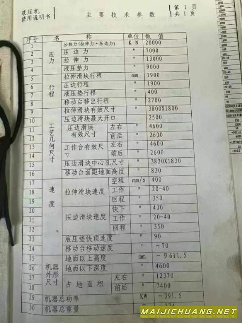 合肥锻压2000吨滑块行程:1500mm开口高.