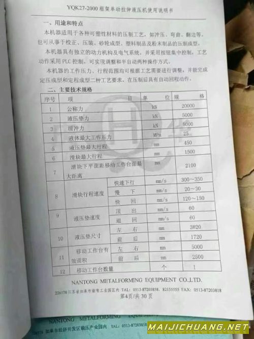 南通总厂2000吨框架液压机。有效台面2..